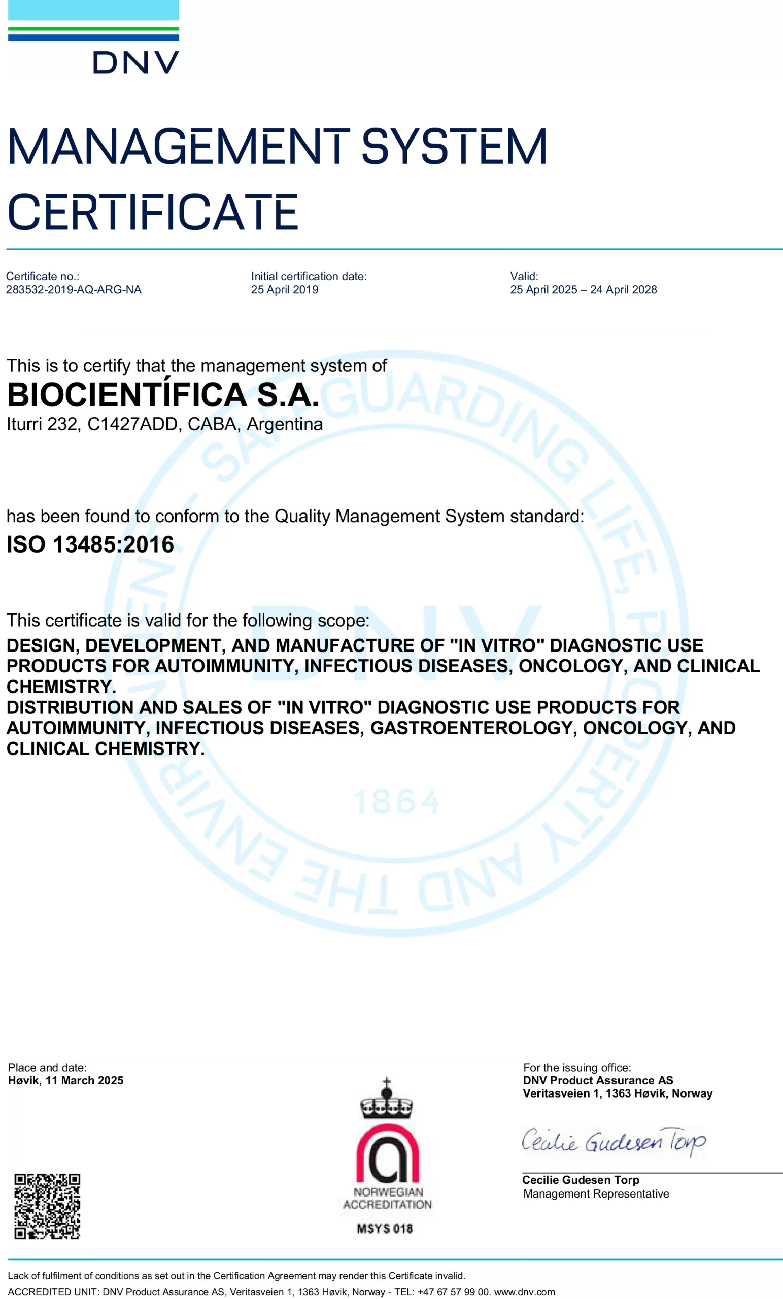 Biocientífica SA fue fundada por el Dr. Roberto Sedlinsky para desarrollar, producir y comercializar en Argentina reactivos de diagnóstico in vitro para enfermedades humanas. Los primeros productos estuvieron destinados al diagnóstico de enfermedades autoinmunes e infecciosas poco frecuentes o de difícil detección y medición de proteínas plasmáticas de interés clínico.